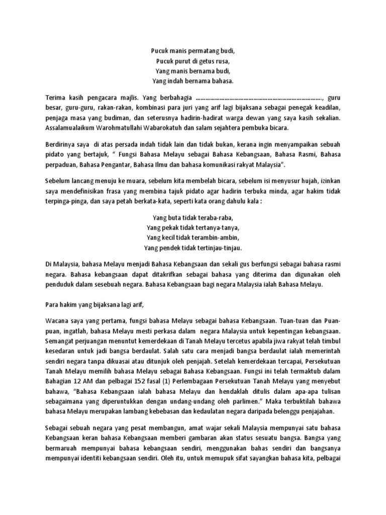 Bagi karangan berformat ia terdiri daripada karangan berita, karangan ucapan atau karangan syarahan atau karangan.ceramah atau pidato, karangan wawancara atau dialog atau karangan temuramah, karangan surat kiriman rasmi / surat kiriman tidak rasmi … 20.04.2022 · ciri ragam bahasa indonesia lama masih dipengaruhi oleh bahasa melayu. Alasan bahasa melayu menjadi bahasa indonesia : Hier sollte eine beschreibung angezeigt werden, diese seite lässt dies jedoch nicht zu. Pantun berasal dari akar kata "tun" dimana banyak suku bangsa nusantara yang memilikinya. Mulai tahun 2021, kertas 1 mata pelajaran bahasa melayu dalam peperiksaan spm (1103/1) akan menggunakan format baharu. 30.01.2018 · 4 metodepidato dalam bahasa indonesia merupakan metode atau cara yang bisa digunakan penyampai pidato dalam menyampaikan pidatonya.