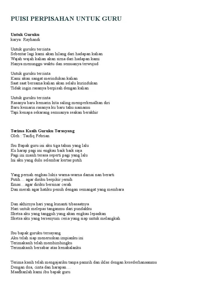 Untuk acara perpisahan wisuda kelas 6 sd singkat dan jelas . Pidato perpisahan tersebut umumnya diisi oleh kepala sekolah, perwakilan guru, perwakilan orang tua sebagai wali murid, perwakilan siswa yang . 10 ucapan perpisahan untuk guru dari para murid yang menyentuh hati serta penuh rasa terimakasih pada guru yang telah berjasa. Dari tindakan kami atau ucapan kami tidak diterima di hati para guru. Berikut ini 11 contoh kata kata perpisahan untuk guru atau wali kelas, ucapan terima kasih menyentuh hati dari murid, baca disini.